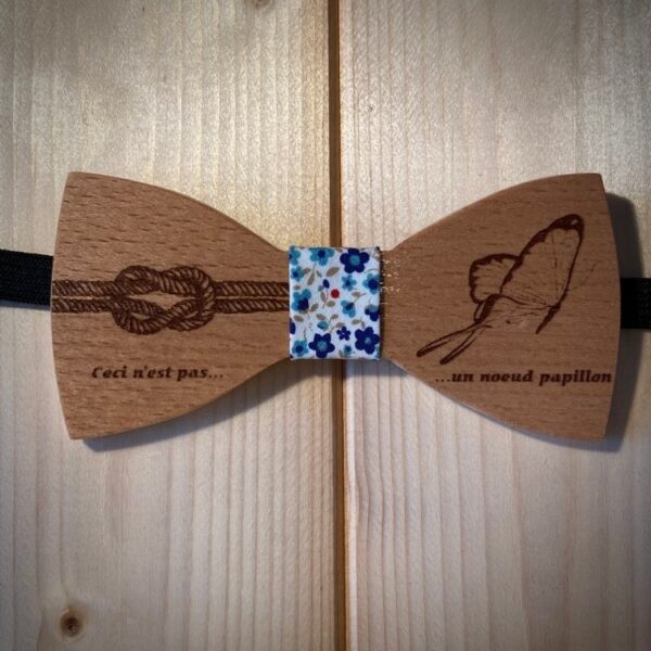 Nœud en bois gravé au laser sur le thème “Ceci n’est pas un nœud papillon”